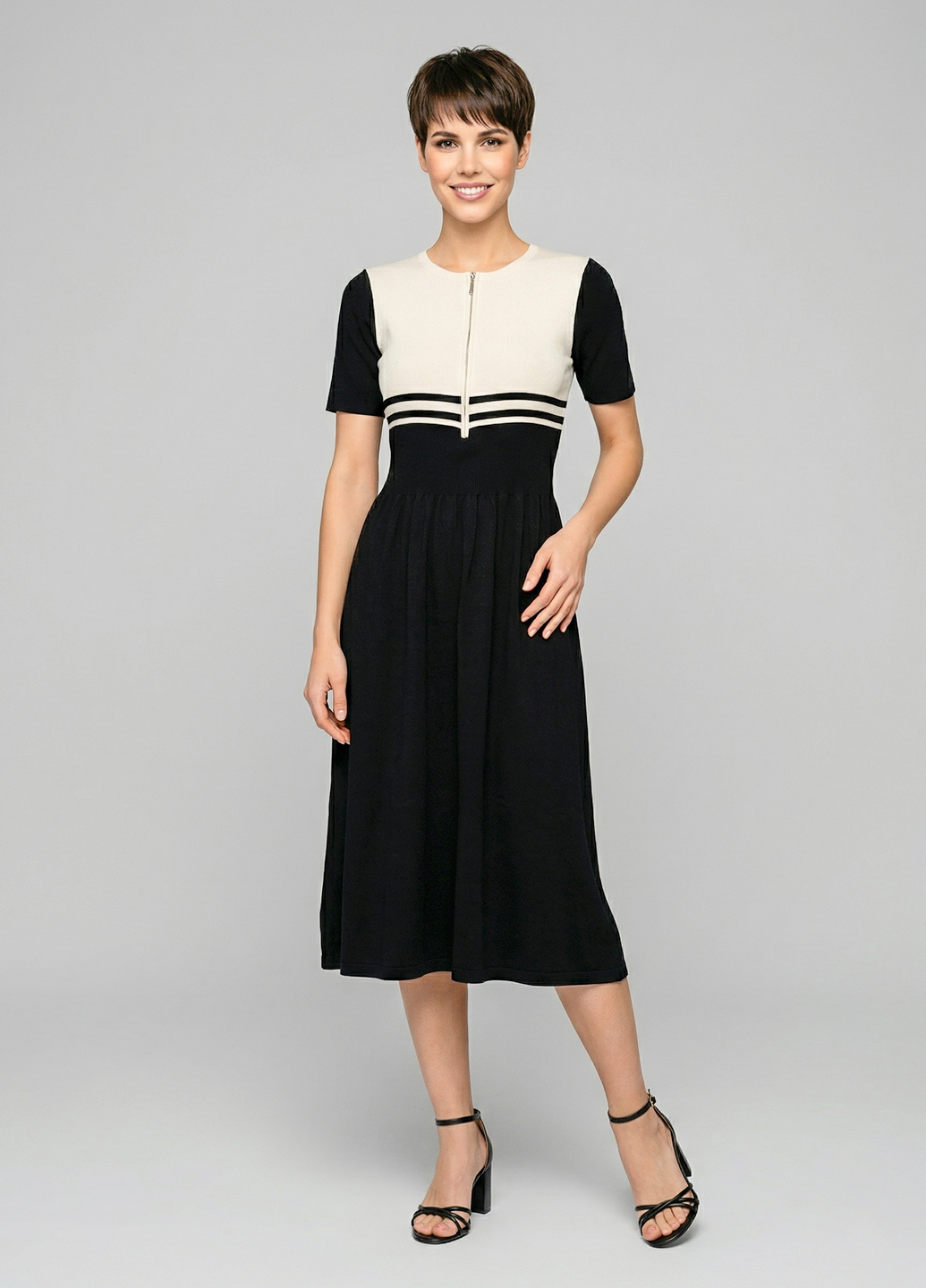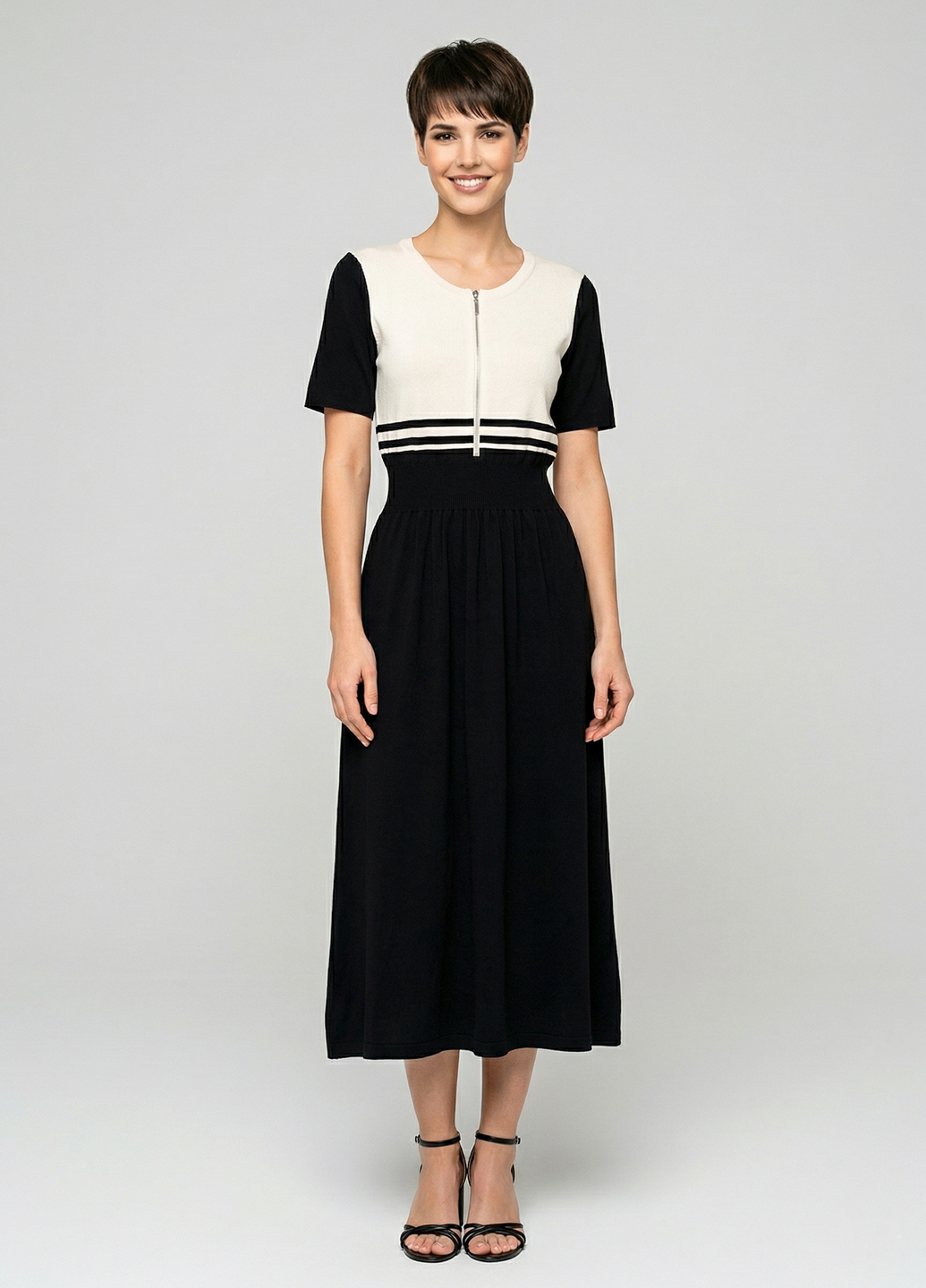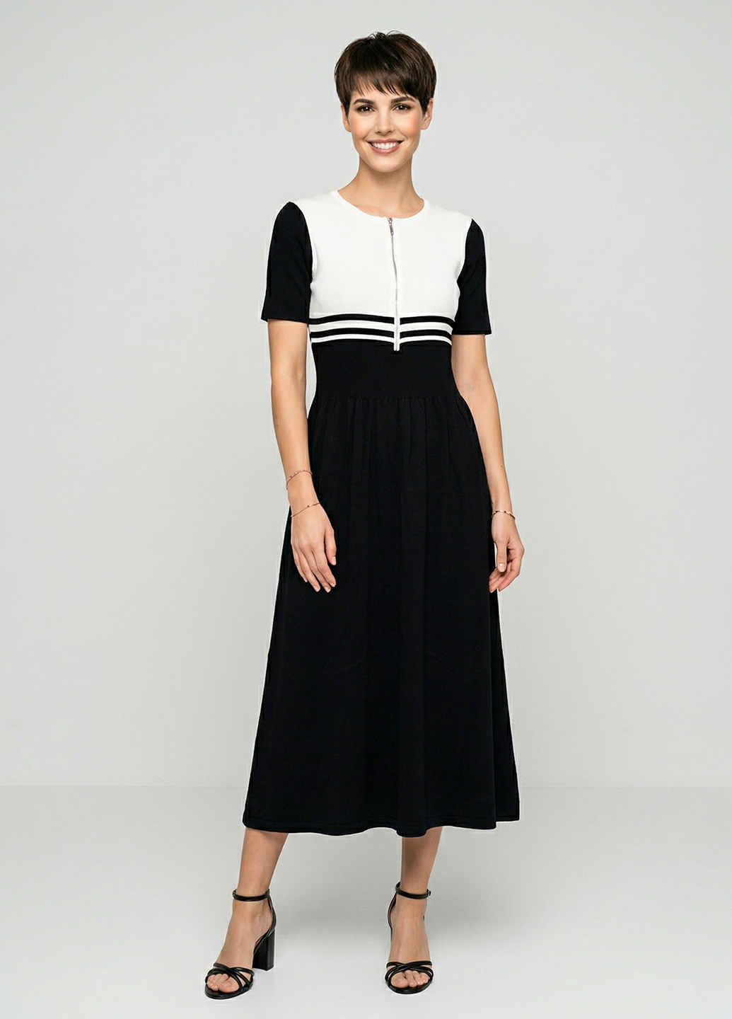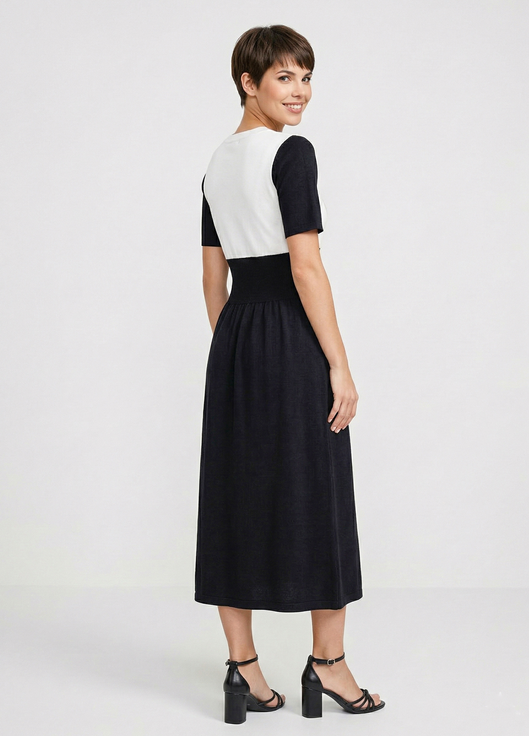 Контрастна чорно-біла трикотажна сукня — це елегантний та універсальний варіант, який підійде як для повсякденного образу, так і для ділових чи вечірніх заходів. Воно поєднує в собі строгість і комфорт завдяки м'якому трикотажу та виразній колірній палітрі. Довжина 114см, довжина рукава 23см, окр.грудей 74-120см, талія 68-114см. Вага 400г.