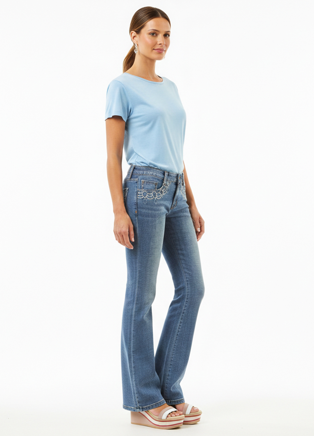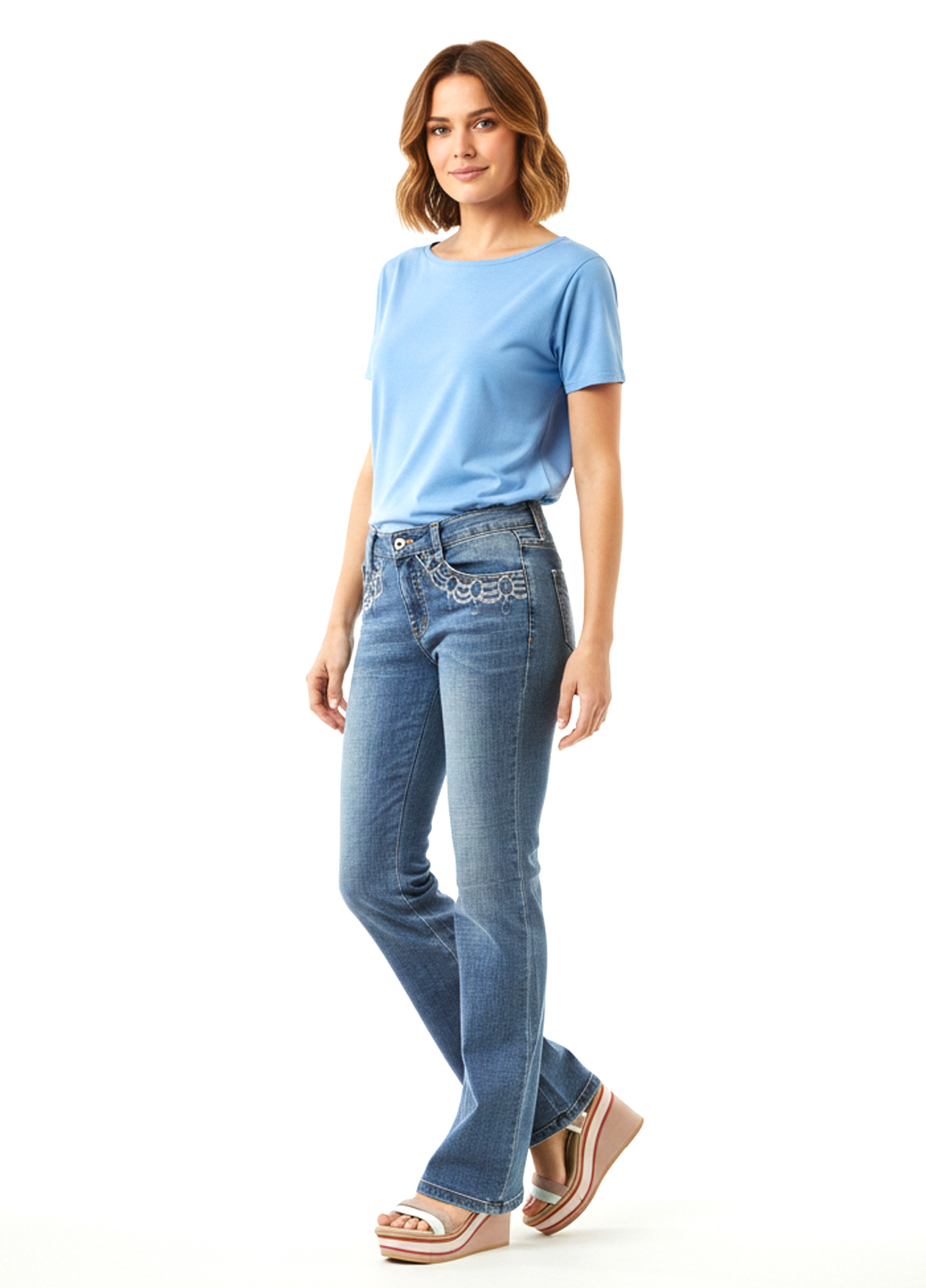 Сині демісезонні джинси клешені - це модель джинсів, яка має вільний крій по всій довжині і розширюється донизу, створюючи ефект "клеша" або "дзвін". Вони можуть бути виконані у синьому кольорі та призначені для носіння у перехідний період між сезонами. Клешені джинси створюють модний і стильний образ, надають деяку ретро-естетику і збільшують об'єм ноги, що може бути цікавим варіантом для тих, хто віддає перевагу незвичайним силуетам і модним експериментам. Ви можете носити ці джинси з футболками, блузами, светрами або навіть піджаком, щоб створити різноманітні образи під ваш стиль і уподобання.