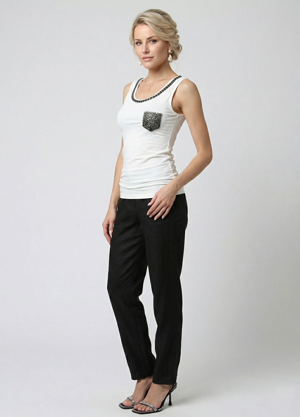 Ця жіноча майка з декором є вишуканою і стильною моделлю, яка підкреслить вашу індивідуальність і додасть витонченості вашому образу. Майка виконана з якісного та легкого матеріалу, що забезпечує комфорт та приємне відчуття на шкірі. Її декоративні елементи надають їй особливої привабливості. Майка з декором ідеально поєднується з джинсами, спідницями чи шортами, створюючи легкий та свіжий образ. Ви також можете носити її під кардиганом, жакетом або блейзером, щоб додати структуру та шаруватість вашого вбрання. Ви можете вибрати майку з декором, який відповідає вашому стилю та настрою.