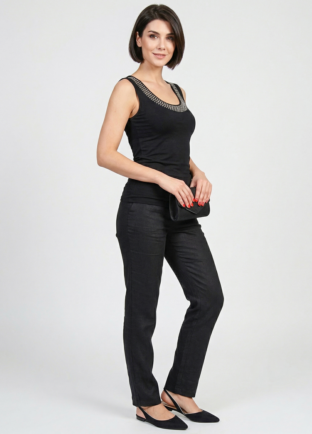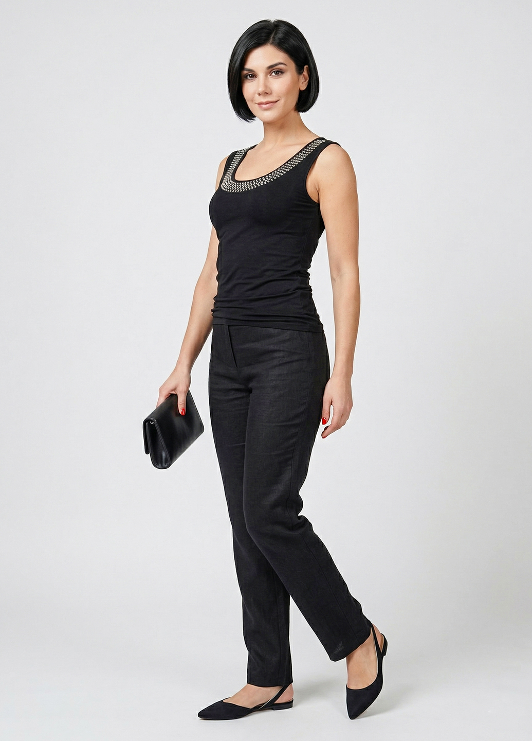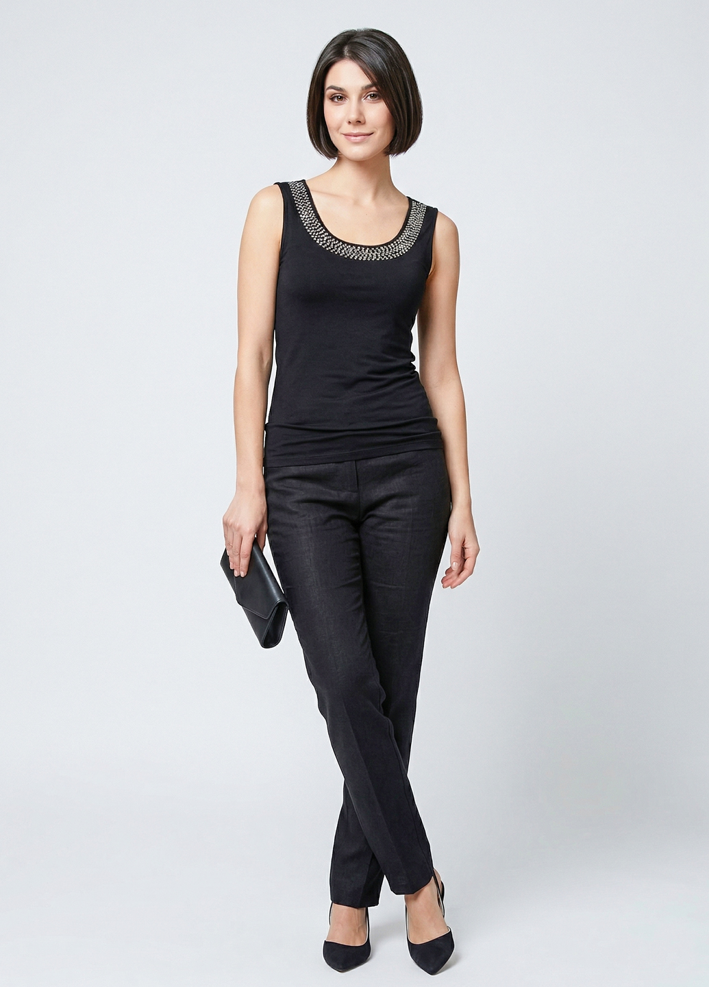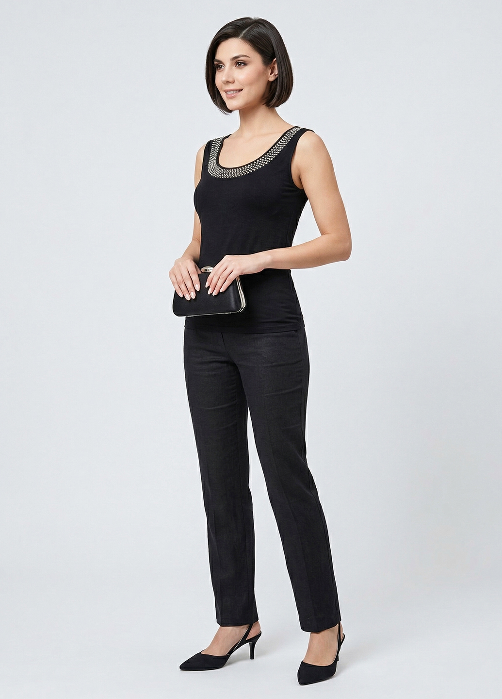 Ця жіноча майка з декором є вишуканою і стильною моделлю, яка підкреслить вашу індивідуальність і додасть витонченості вашому образу. Майка виконана з якісного та легкого матеріалу, що забезпечує комфорт та приємне відчуття на шкірі. Її декоративні елементи надають їй особливої ​​привабливості. Майка з декором ідеально поєднується з джинсами, спідницями чи шортами, створюючи легкий та свіжий образ. Ви також можете носити її під кардиганом, жакетом або блейзером, щоб додати структуру та шаруватість вашого вбрання. Ви можете вибрати майку з декором, який відповідає вашому стилю та настрою.