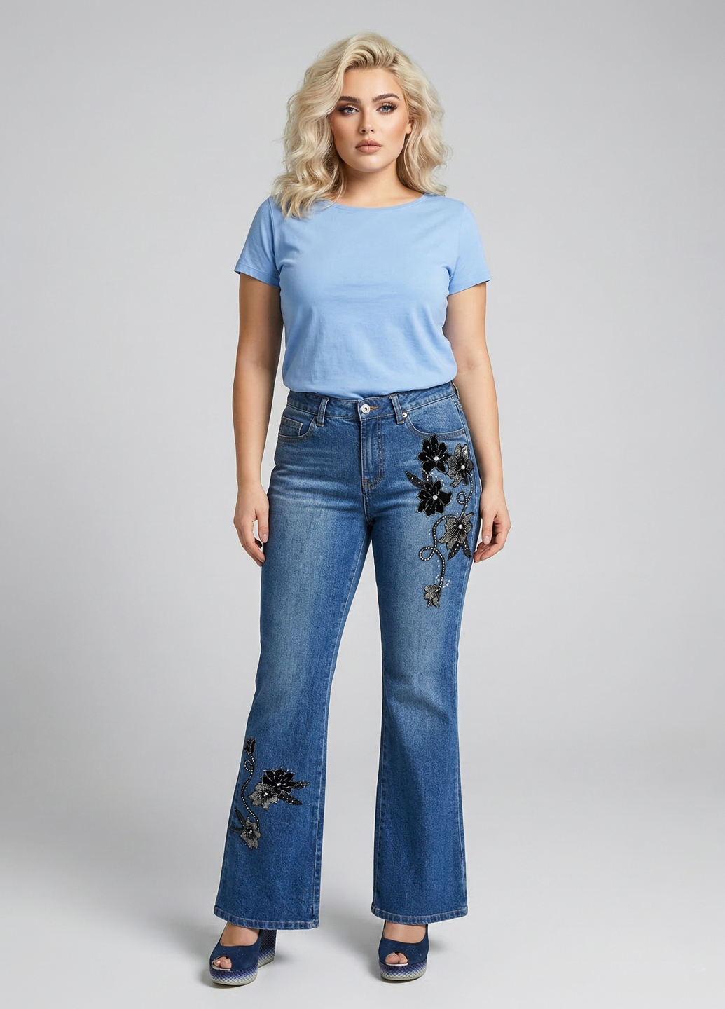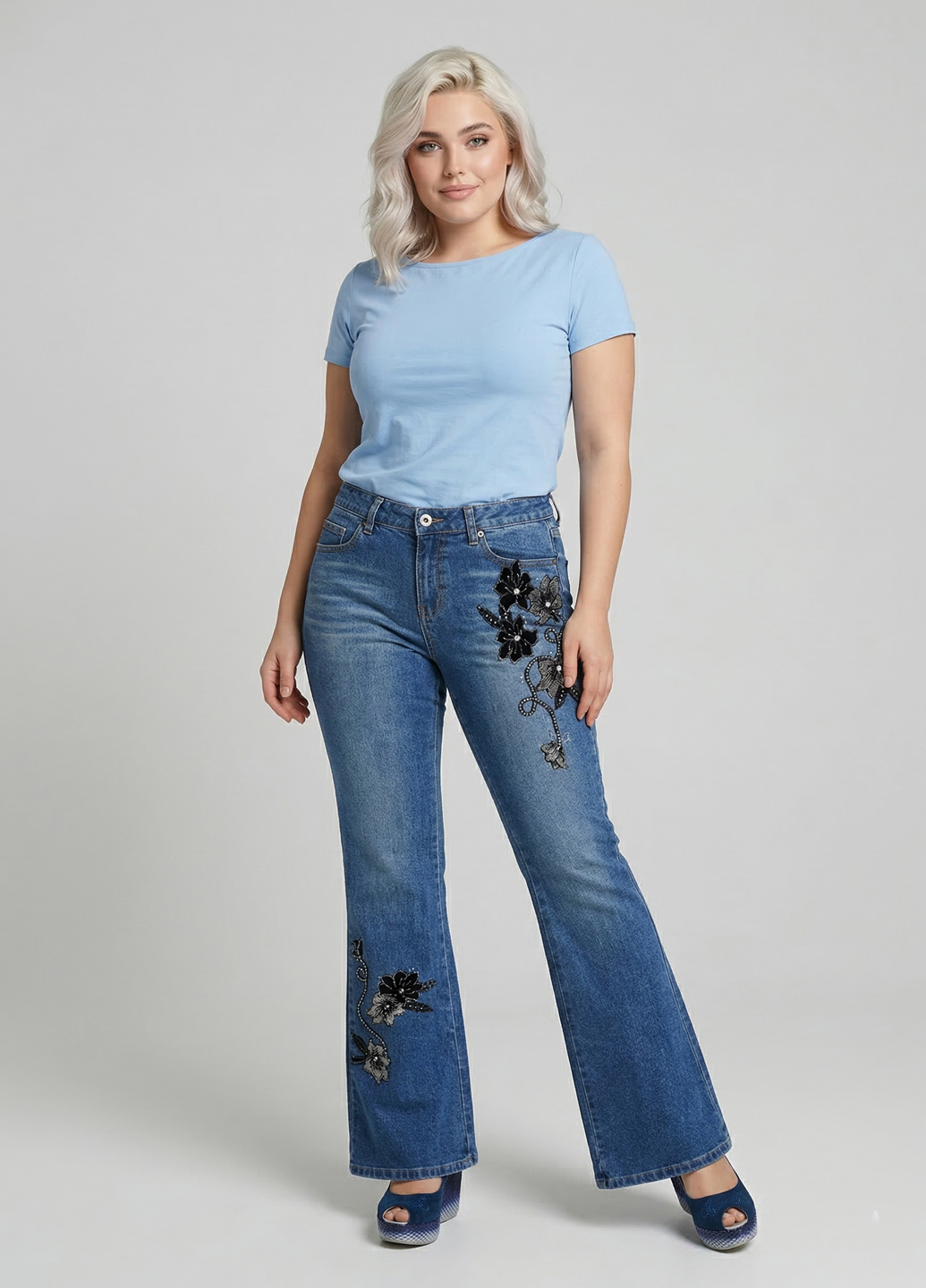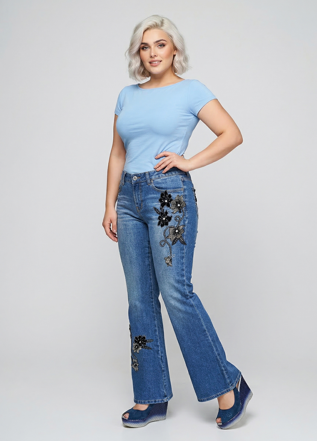 Жіночі джинси - це стильна і вінтажна модель штанів. Вінтажні джинси з вишивкою можуть бути унікальним і стильним елементом гардеробу. Ви можете шукати такі вироби у магазинах вінтажного одягу, онлайн-аукціонах чи спеціалізованих інтернет-магазинах, які пропонують вінтажні моделі. Склад джинсової тканини: бавовна 96% поліуретан 4%. Завдяки доданню 4% поліуретану тканина ідеально облягає вашу фігуру. Посадка середня. Довжина джинсів вище за середній, т.к. джинси можна носити на високих підборах за будь-якого зростання.