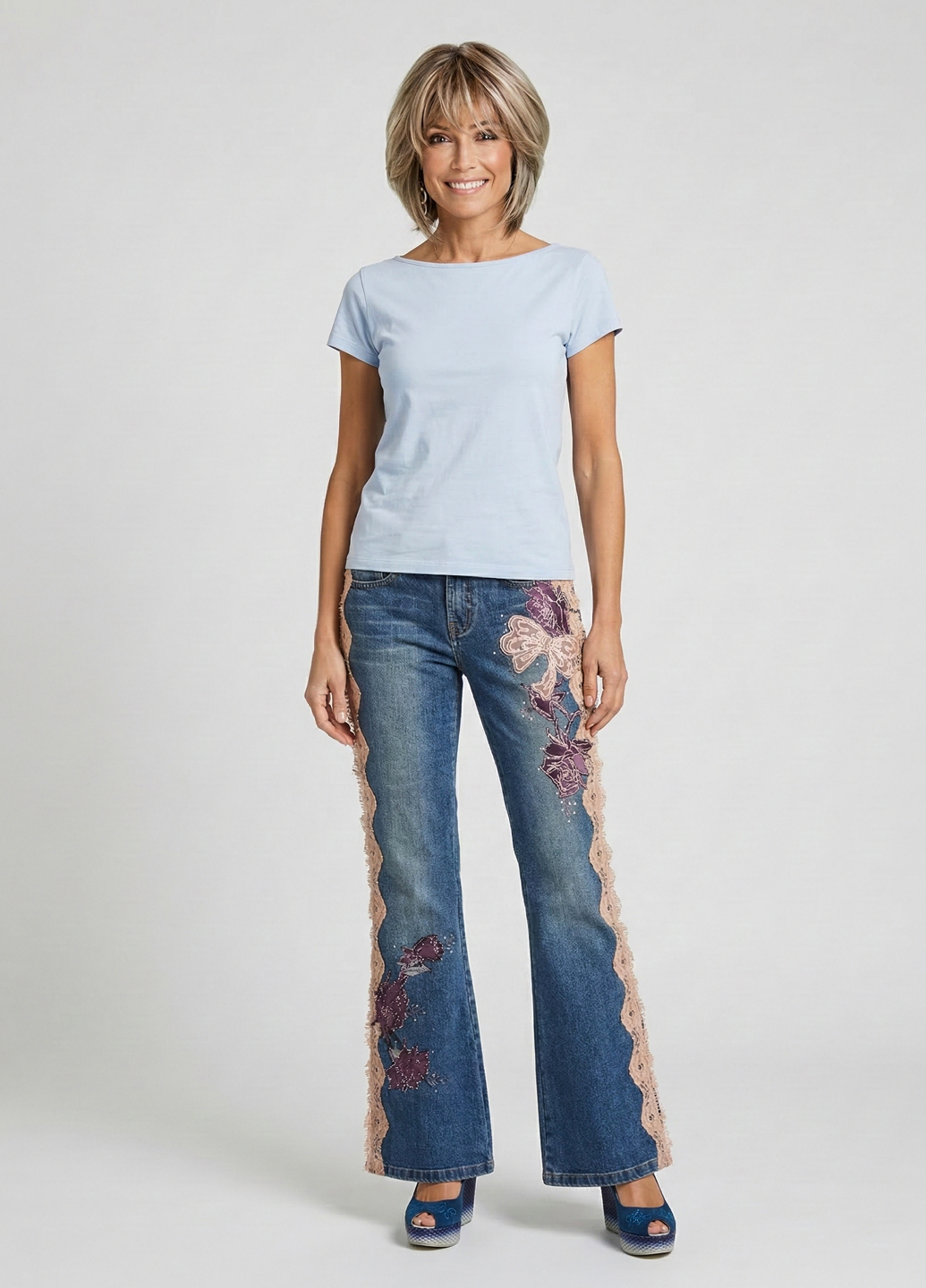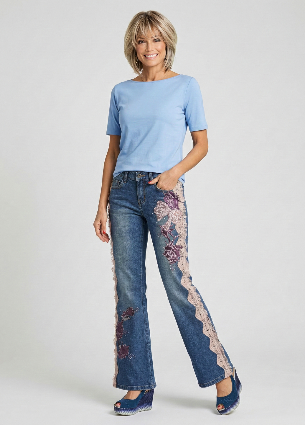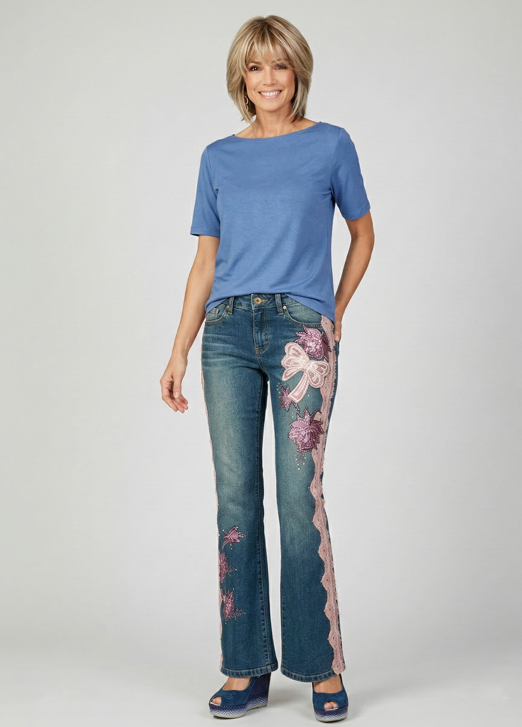 Жіночі джинси - це стильна і вінтажна модель штанів. Вінтажні джинси з вишивкою можуть бути унікальним і стильним елементом гардеробу. Ви можете шукати такі вироби у магазинах вінтажного одягу, онлайн-аукціонах чи спеціалізованих інтернет-магазинах, які пропонують вінтажні моделі. Склад джинсової тканини: бавовна 96% поліуретан 4%. Завдяки доданню 4% поліуретану тканина ідеально облягає вашу фігуру. Посадка середня. Довжина джинсів вище за середній, т.к. джинси можна носити на високих підборах за будь-якого зростання.
